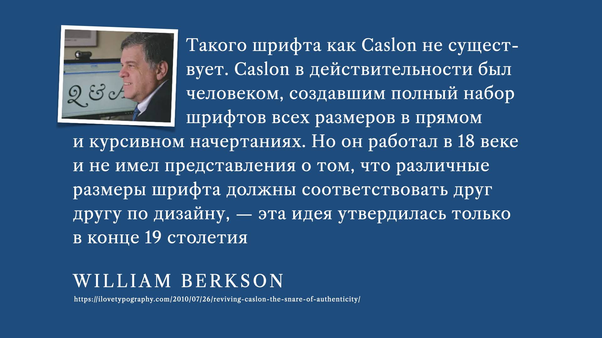 Сaslon — это старо-стильная антиква созданная в начале 18-го века. В отличие от всех других Кэзлонов — эта версия основывается не на образцах 18-го века, а на рукописном шрифте Caslon в американских плакатах 1960-х годов. Т.е. люди брали широкое перо и писали в стиле Caslon. Это делает шрифт наиболее современным из всех Кэзлонов, однако и наиболее простым с точки зрения контуров. Никаких тебе излишних и декоративных изгибов.