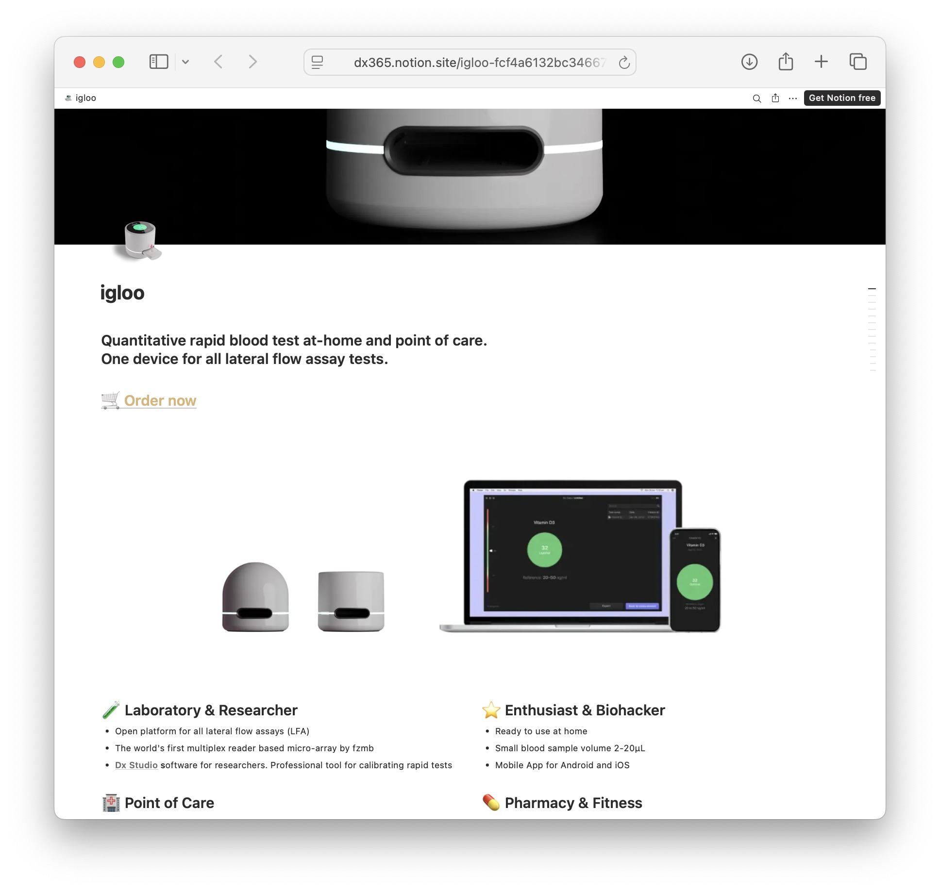 Проект Igloo — компактная диагностическая система для анализа биоматериала путем хромотографии. Капнул кровь на одноразовый тест (например, ферритин), поместил тест в устройство и через 15 минут увидел результат.
