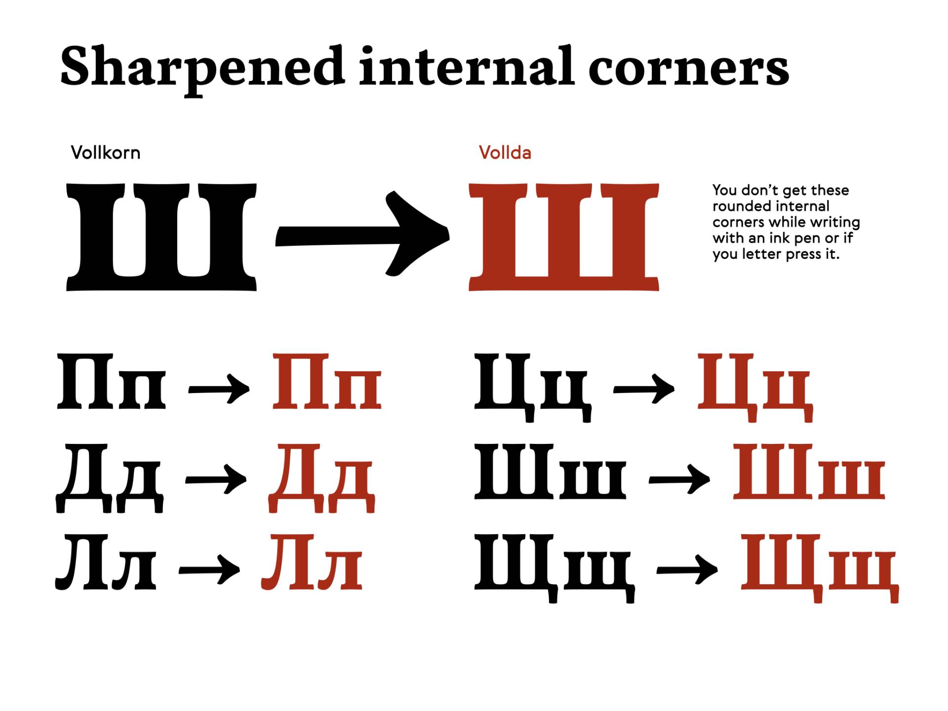 • И наконец, я удалил внутренние скруглённые углы в кириллических «Пп, Дд, Лл, Цц, Щщ, Шш», потому что эти скругления могли появиться только при высокой печати от расплытия чернил. Т.е. это попытка стилизовать шрифт под старо-стильные антиквы, которые как раз печатались высокой печатью и дошли до наших дней именно таком виде в книгах, если сами матрицы шрифта были утеряны. Сейчас вы не получите таких скруглений, если попытаетесь написать эти буквы широконечным пером или распечатать на лазерном принтере.
